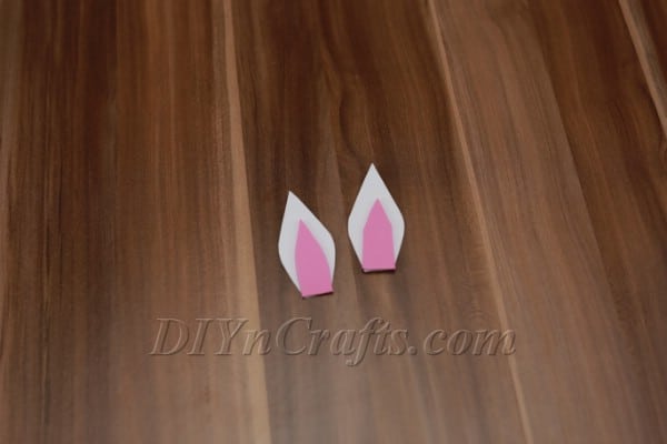 Next, you will create the bunny's ears. To do this, you will need to cut out the shapes of the ears. First, cut them out of the white cardboard, card stock, or paper you are using. Next, cut out the same shapes, but smaller, from the pink foam sheet.