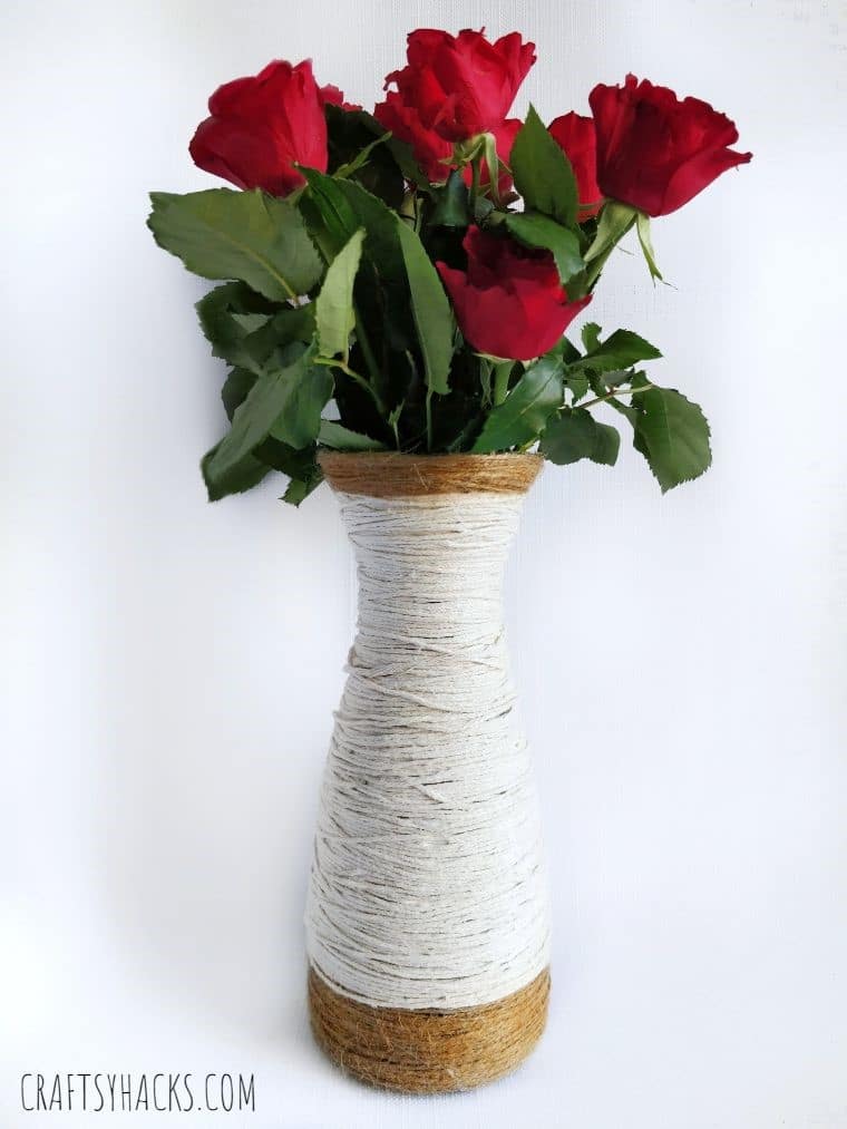 You don’t need to add glue for each row of twine you attach as a dab of glue sticks more than a single line of yarn to the vase.