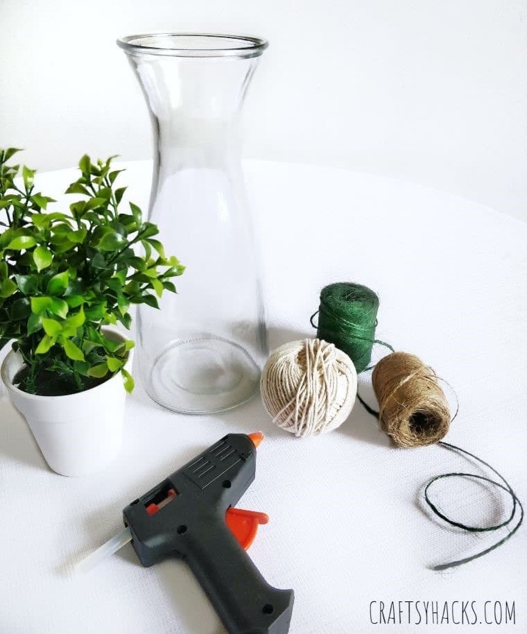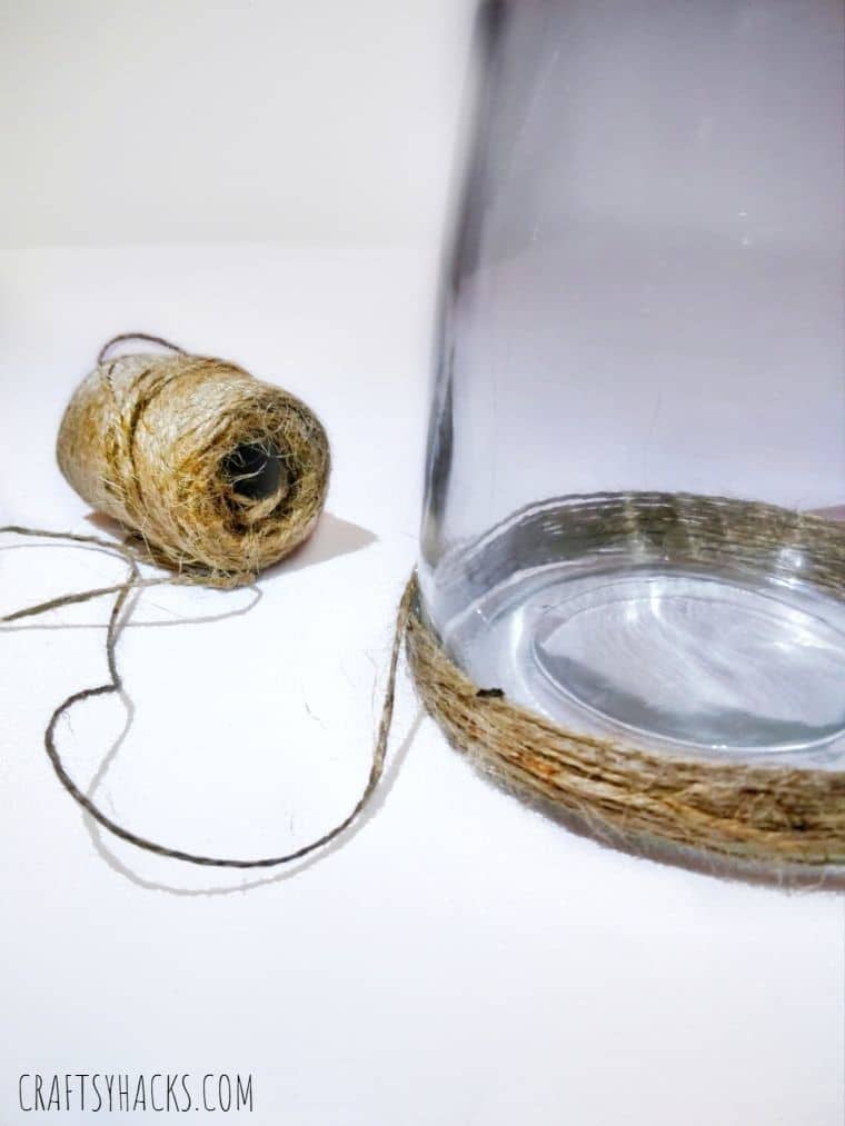 Turn on the glue gun to allow it to start heating up. You want to ensure it gets hot enough for the twine to stick to the glass easily.