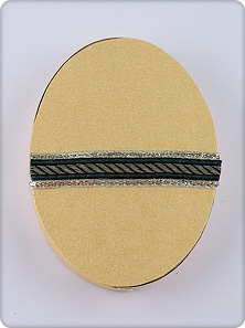 Using craft glue, attach the piece of the black ribbon centered on the top of the oval box lid and glue the two pieces of gold ribbon on the top and bottom edge of the black ribbon. Small amounts of glue can be added to the cut edges of each side of the ribbon to prevent fraying.