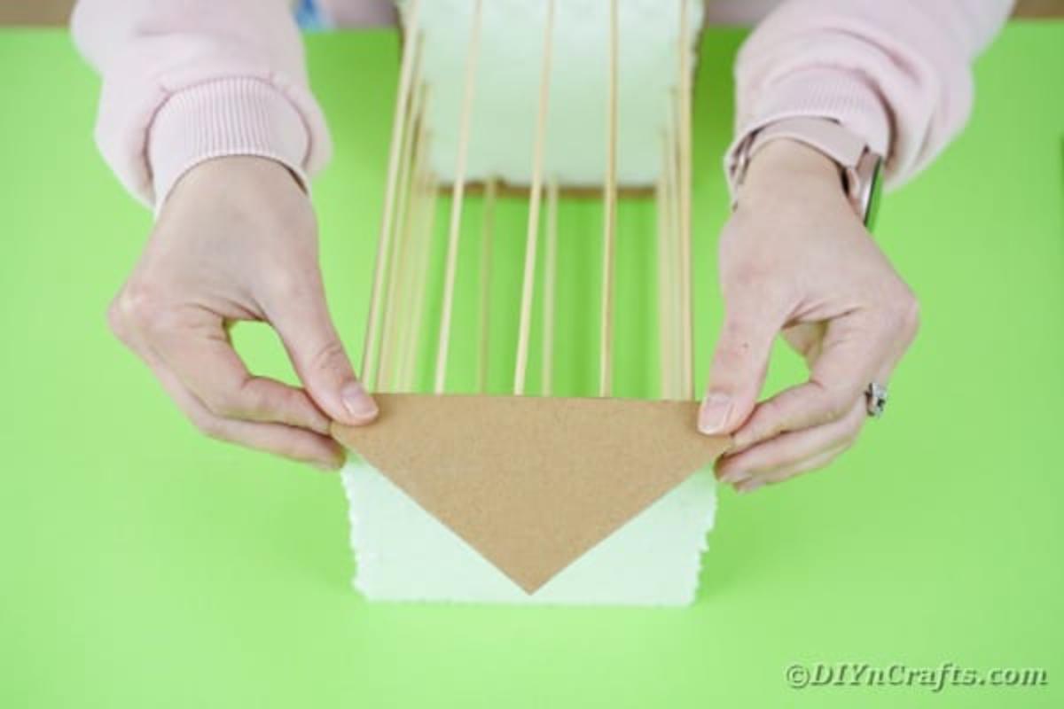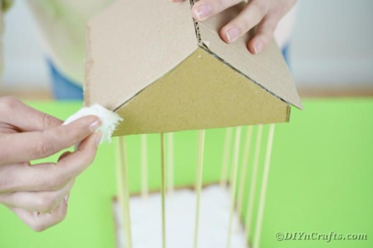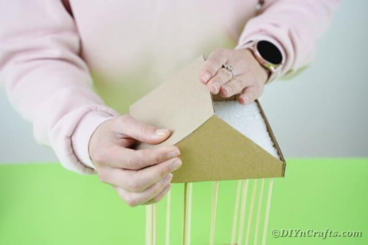 Cut a roof out of cardboard so that you have two triangle pieces that are the width of the side of the styrofoam base and glue these in place.