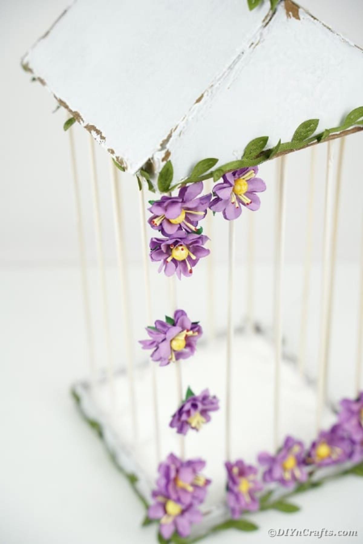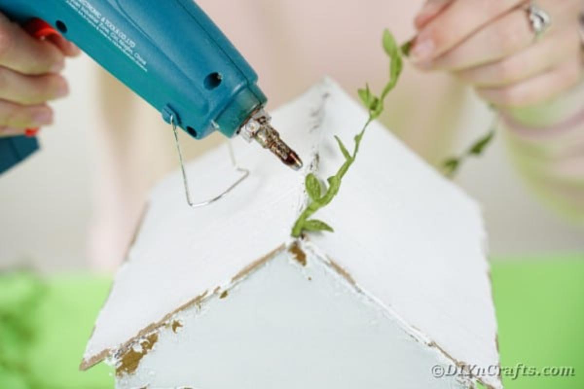 When the paint has dried glue the vine or leaves along the edges and seams of the roof, and around the base of the birdcage.