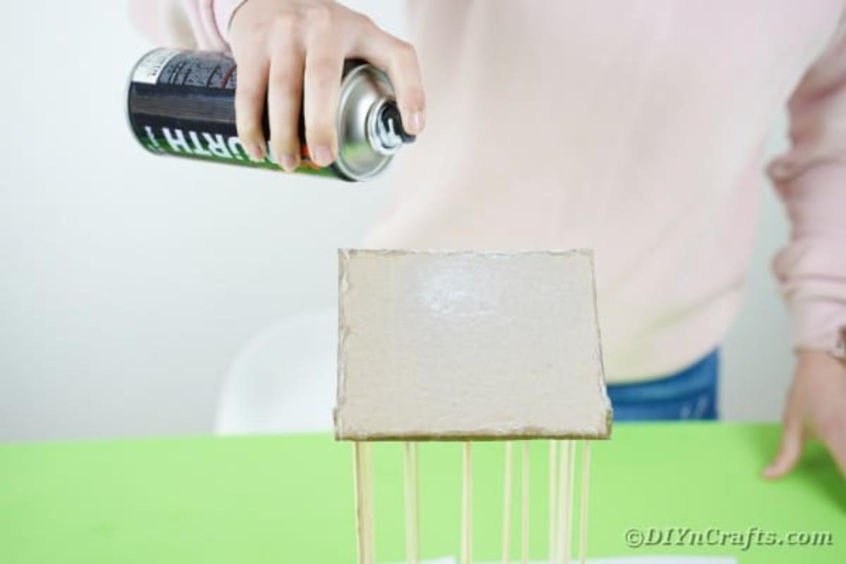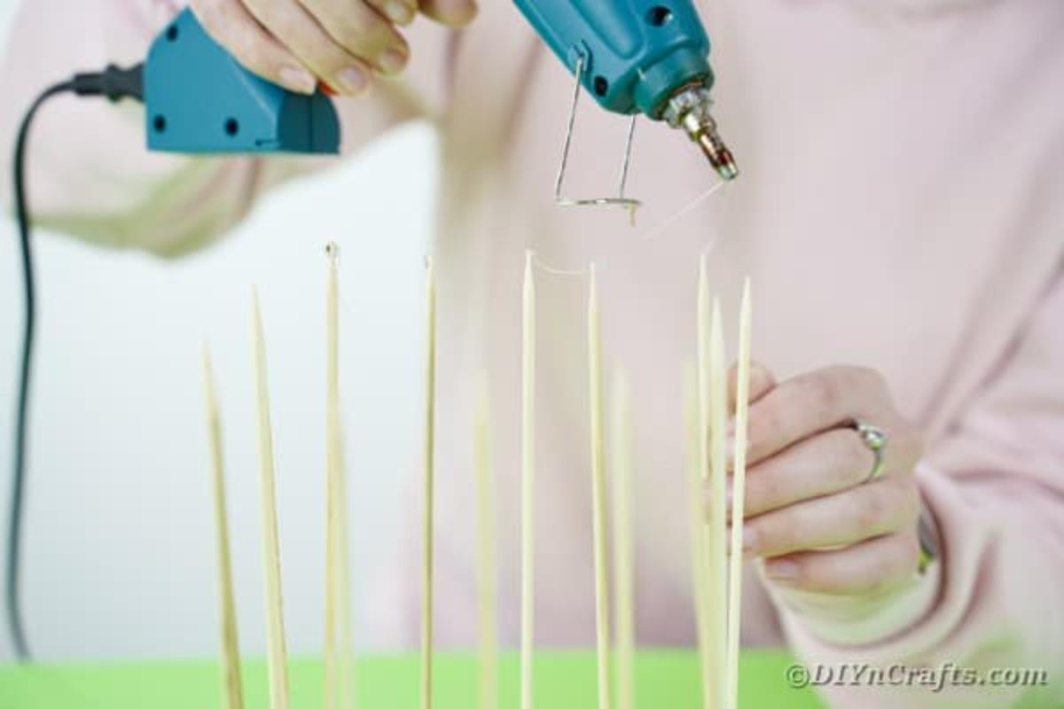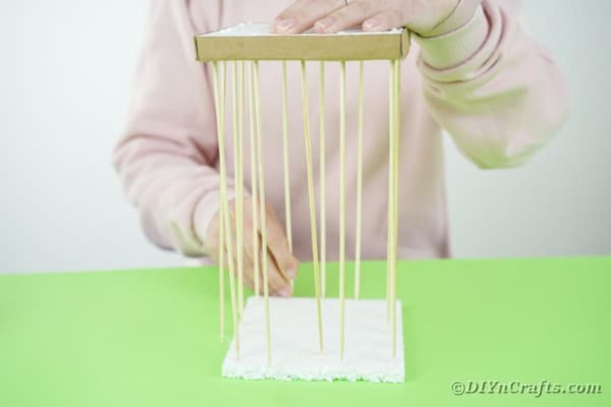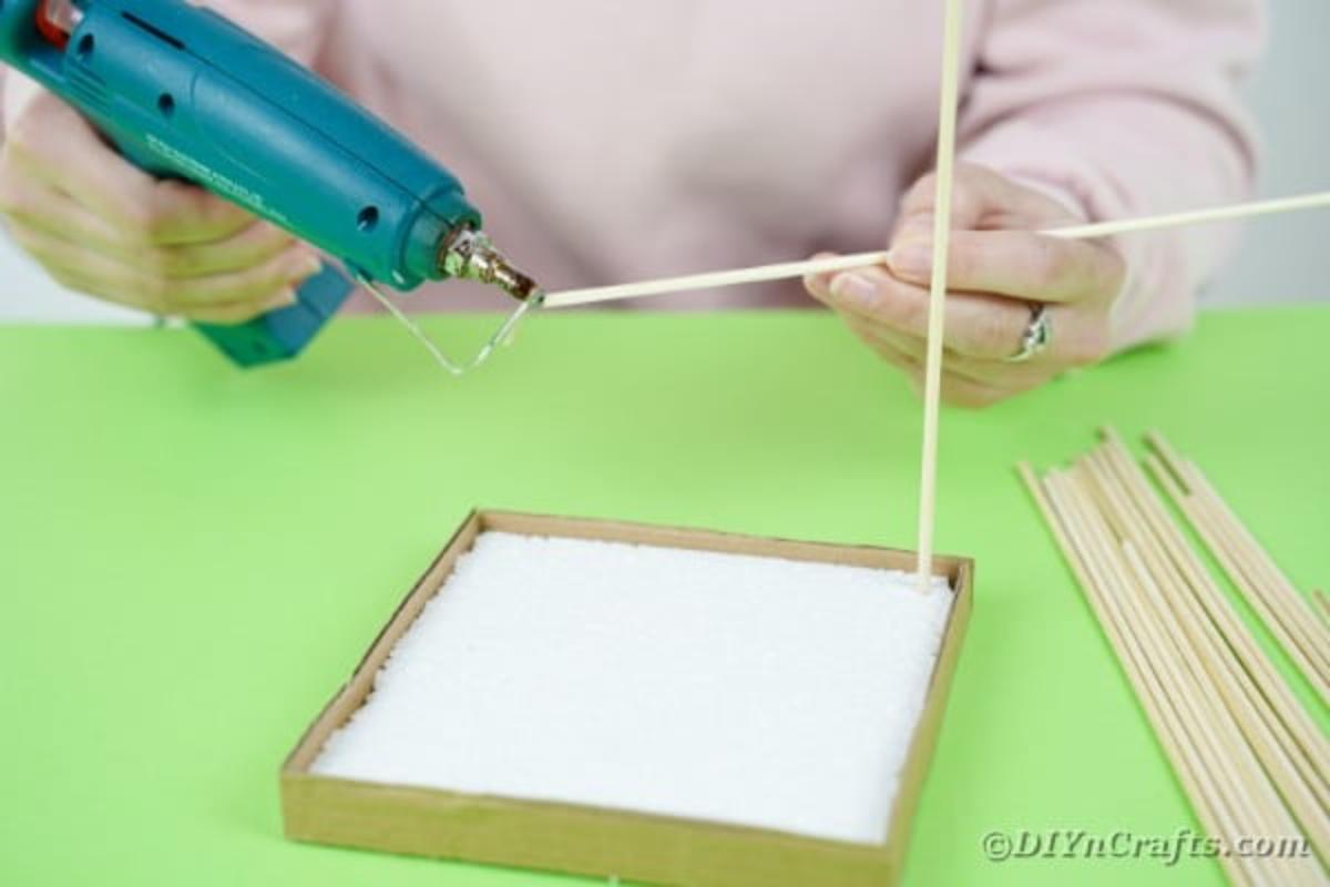 On the top of each of the skewers, add a bit of hot glue, and then place the second piece of styrofoam onto these ends securing them in place by pushing the styrofoam down on them gently.