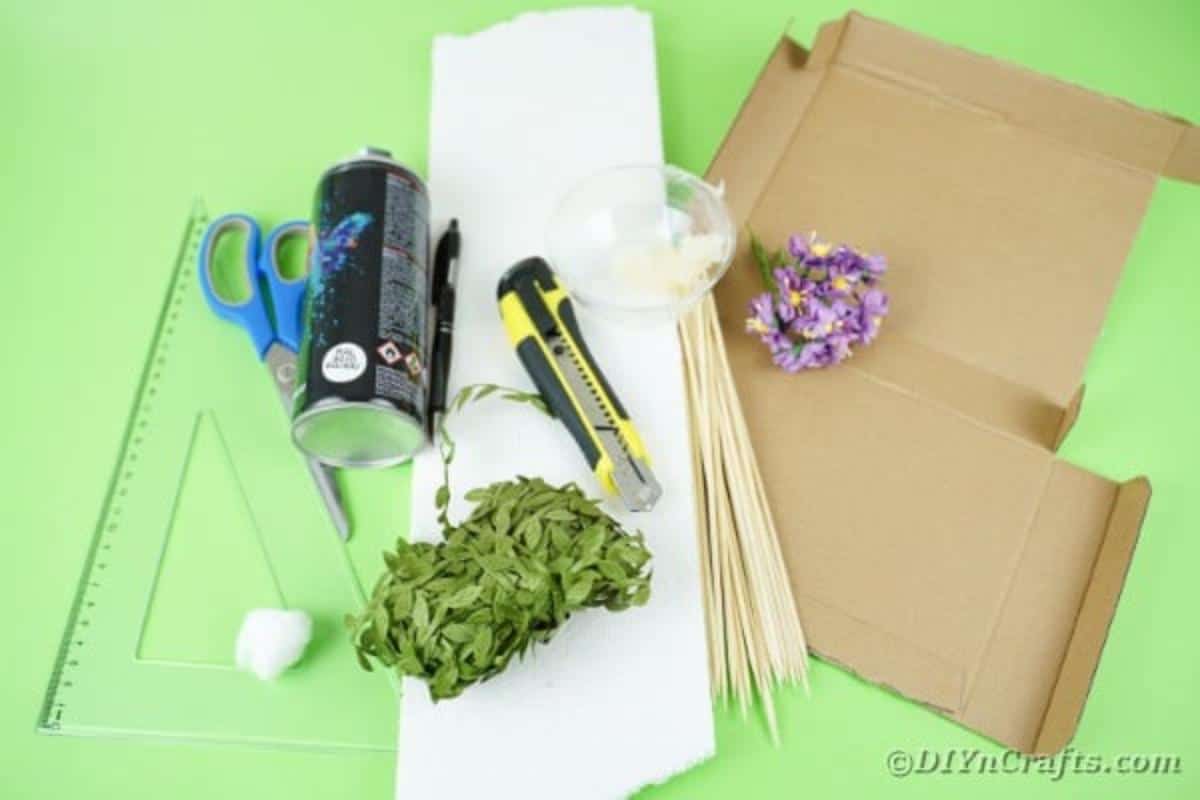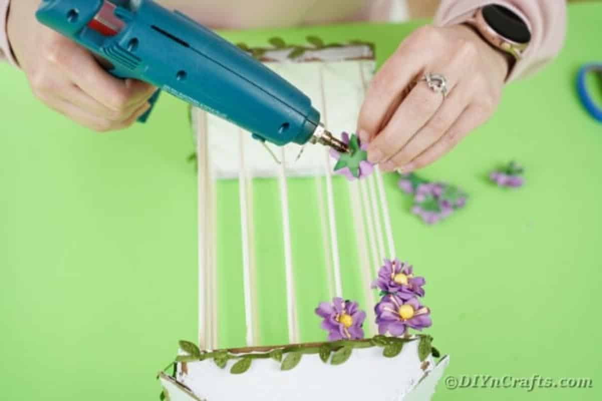 Next, glue the flowers along one side of the bottom and going upwards along with one of the skewers toward the top.