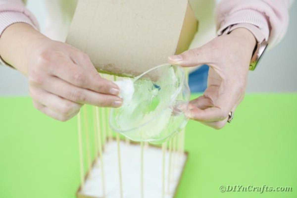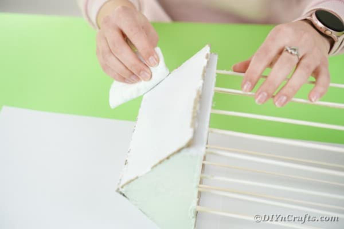 Using a cotton ball, rub a small amount of petroleum jelly around the edges where the roof connects and around the corners of the base. This is used to keep the paint from sticking to the cardboard to create a rustic look.