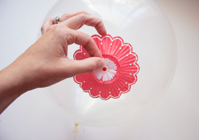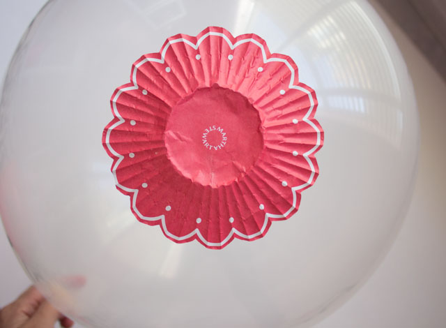 Flatten the cupcake liners and adhere to the balloon with a small piece of double-sided tape.