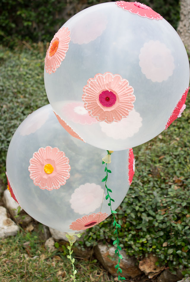 Add a little flower sticker in the middle of the cupcake wrapper. Repeat with as many flowers as you want to cover the balloon (I used around 8 flowers for each of my 17″ balloons)