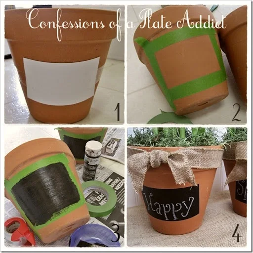 Here’s all you need…clay flower pots, 3x5 note card as a template, chalkboard paint, painter’s tape and ribbon to finish them off!