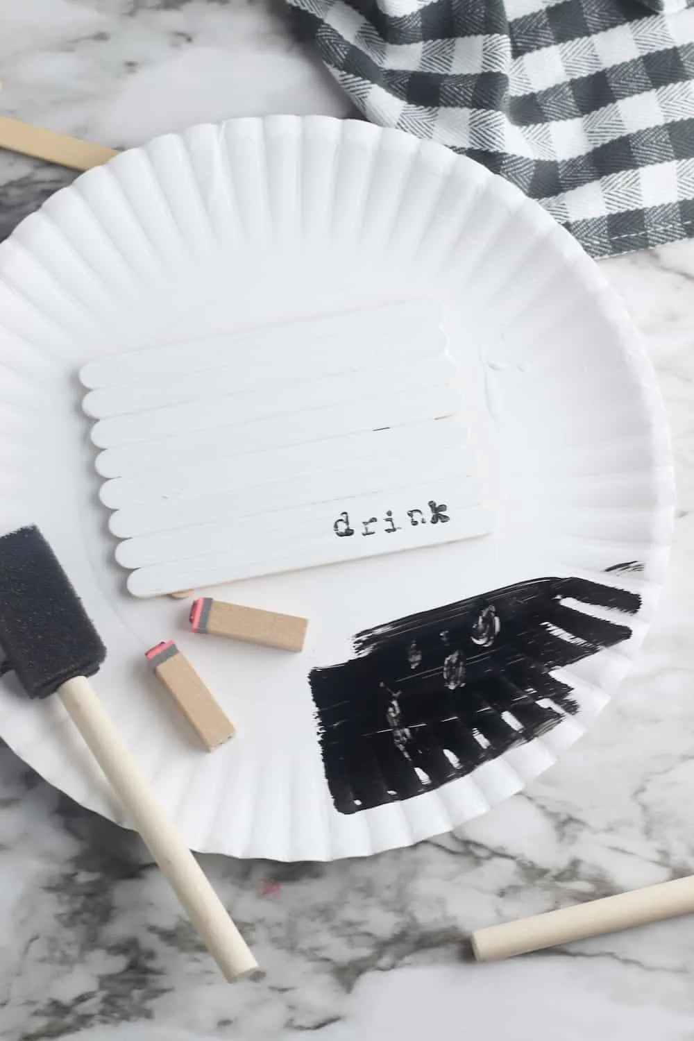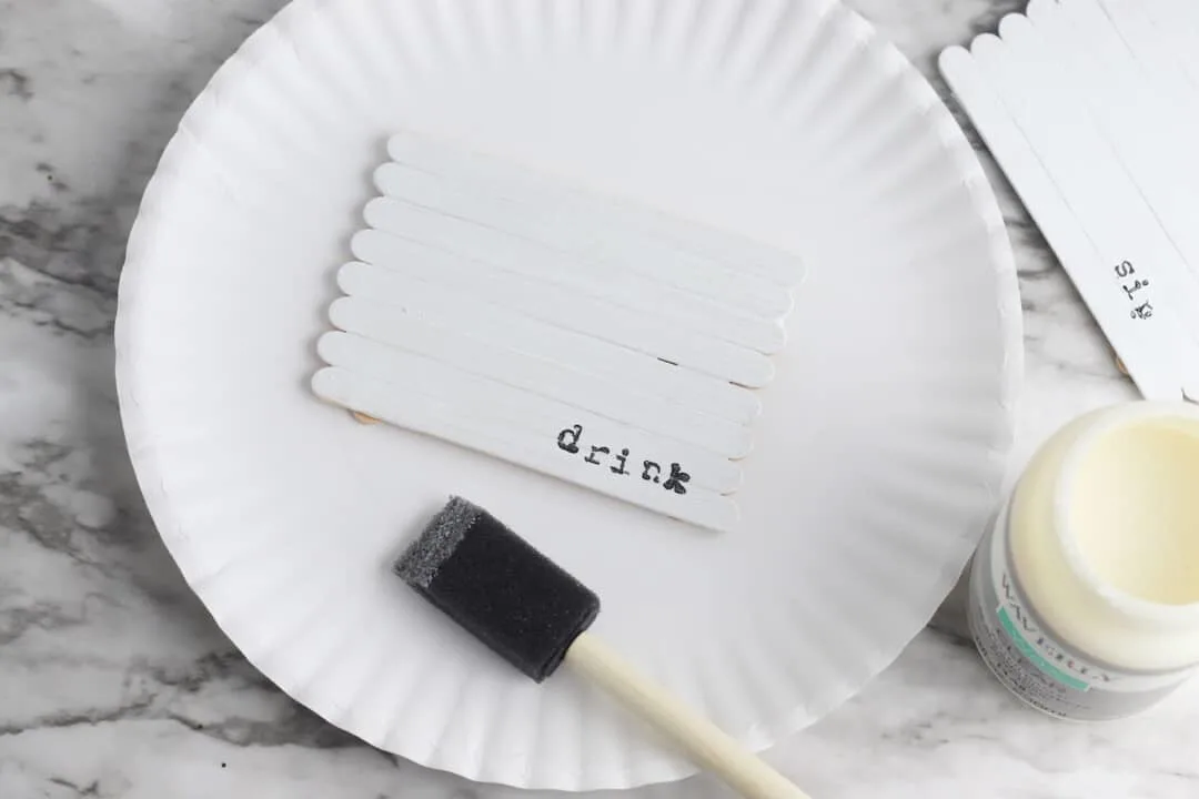 When the paint has dried, spread a thin layer of black chalk paint over a flat surface to work from. Carefully dip your letter stamps into the paint, then press them onto the coasters to spell words.