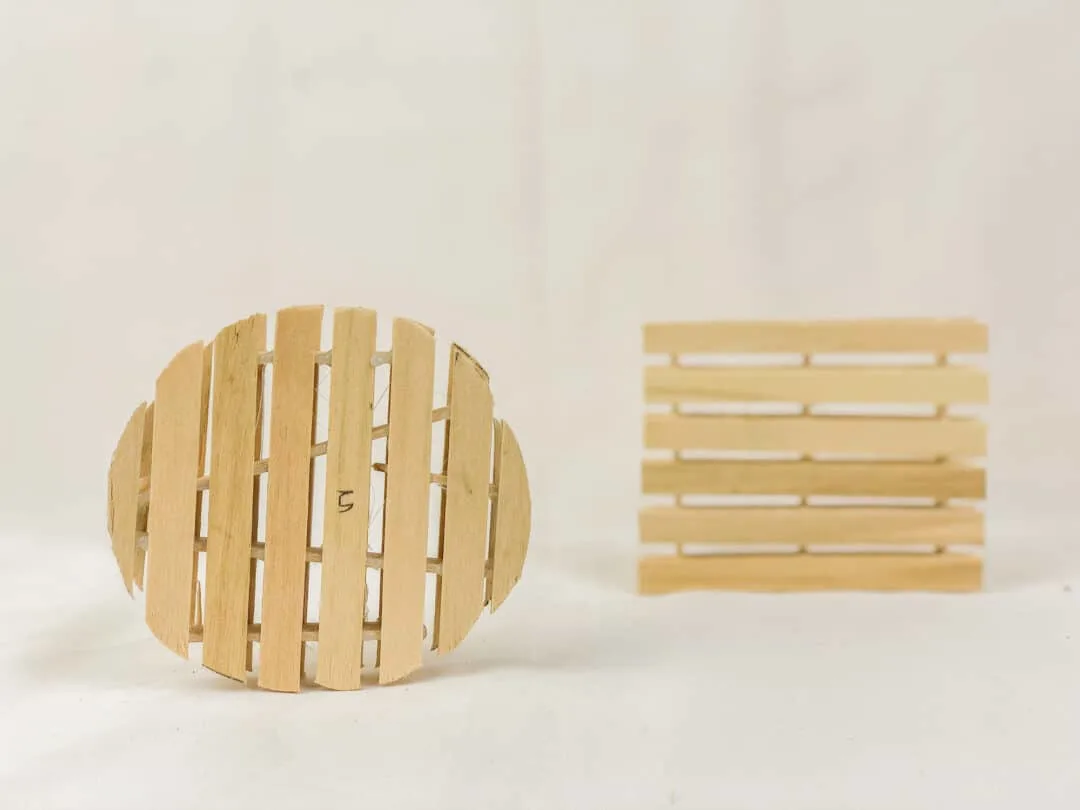 This process works for square drink coasters, too. There is no cutting with the square pattern. Just lay three popsicle sticks perpendicular across the horizontal sticks to make a pallet coaster.