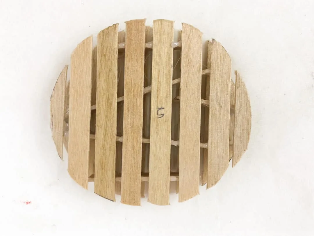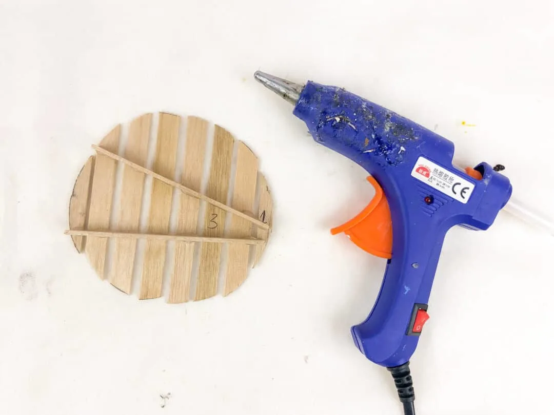 Add a drop of hot glue on each stick and press the stick horizontally across the circle pattern.