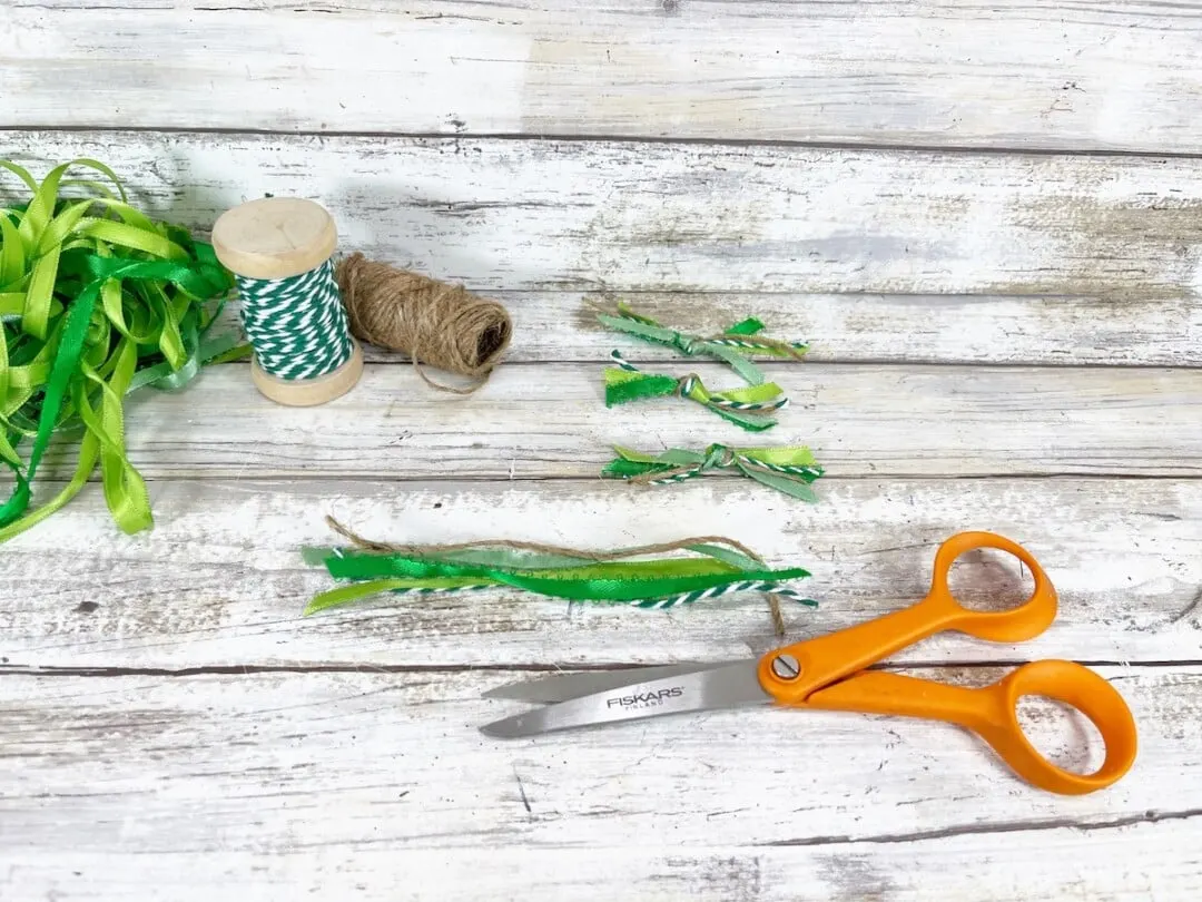 Cut assorted green ribbons, twine, and trims into eight-inch sections. Tie the bunch of trims into a knot around each golf ball pumpkin stem.