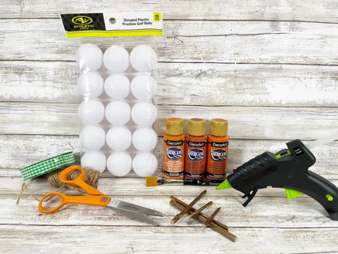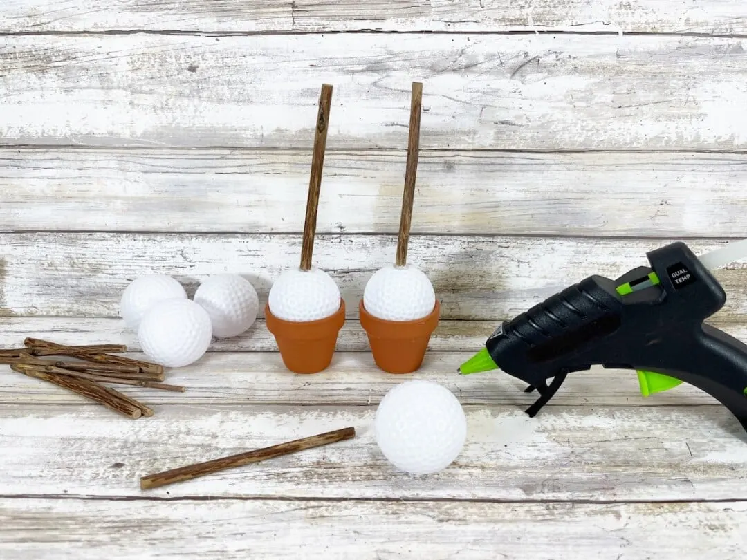 Using small twigs or pieces of tree branches from the yard, glue a twig or branch to the top of each plastic golf ball in the center.
