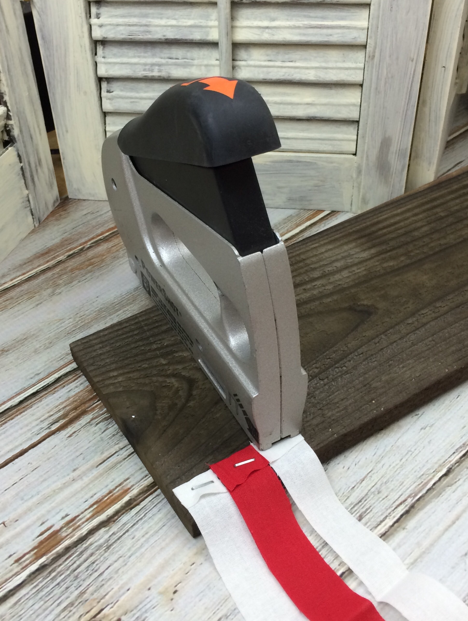 Using my handheld stapler I start by folding one end over and stapling the fabric strip to the bottom of my 4th of July fabric banner sign.