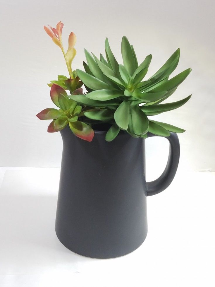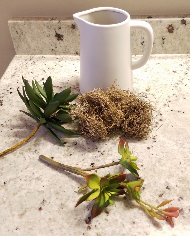 Once dry I filled the now white pitcher with Spanish moss about half way then added the taller faux succulent off to one side.