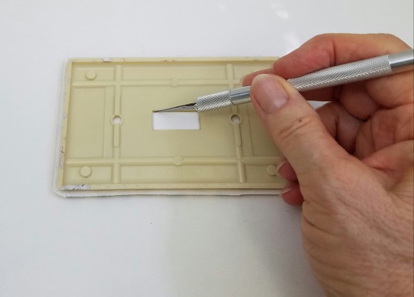 Taking your x-acto knife and using the cutting board to lay the switch plate on face down. Start cutting out the switch opening and the two small hole openings carefully.