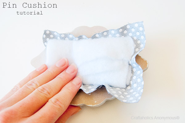 Fold a 6″x8″ piece of batting into a small rectangle and insert where the opening in the frame is.