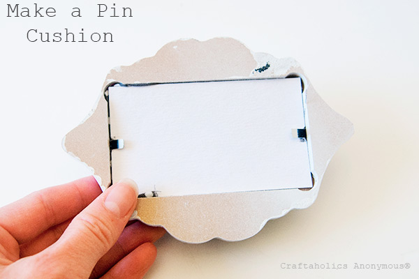 Fold over the edges of the fabric and place the chipboard on top to conceal the raw edges, then fold over the metal tabs to secure in place.