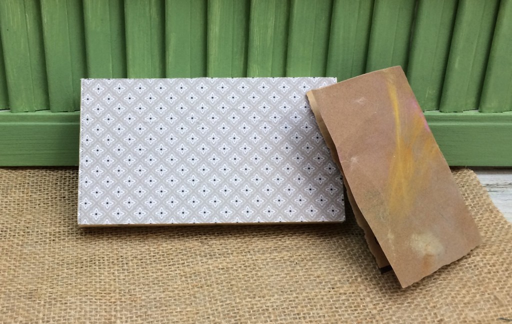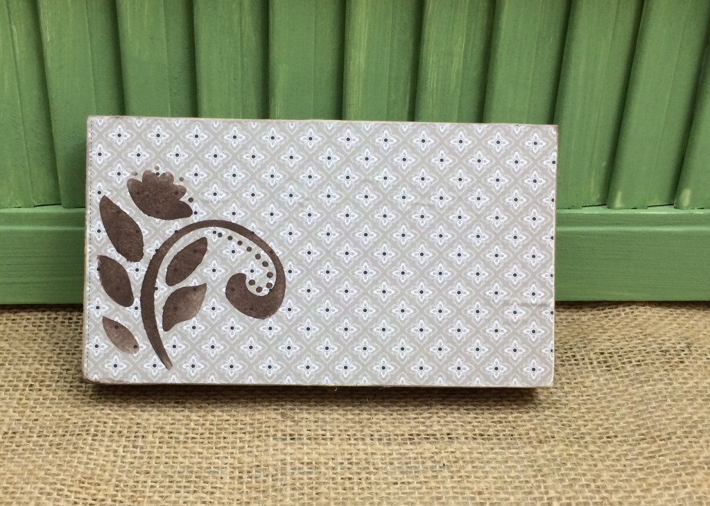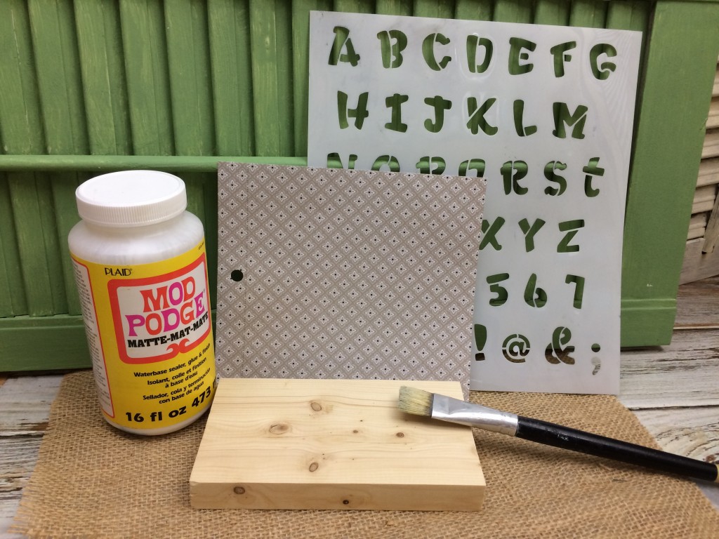 Then glue your scrapbook paper to your block of wood using Mod Podge, and smooth out any wrinkles. Flip over and sit something heavy on it till it dries.
