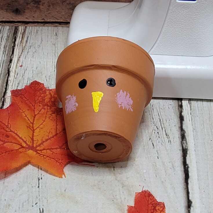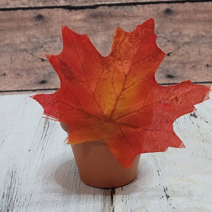 Lastly hot glue the 2 fall leaves on the back side of the terra cotta pot to form the tail.