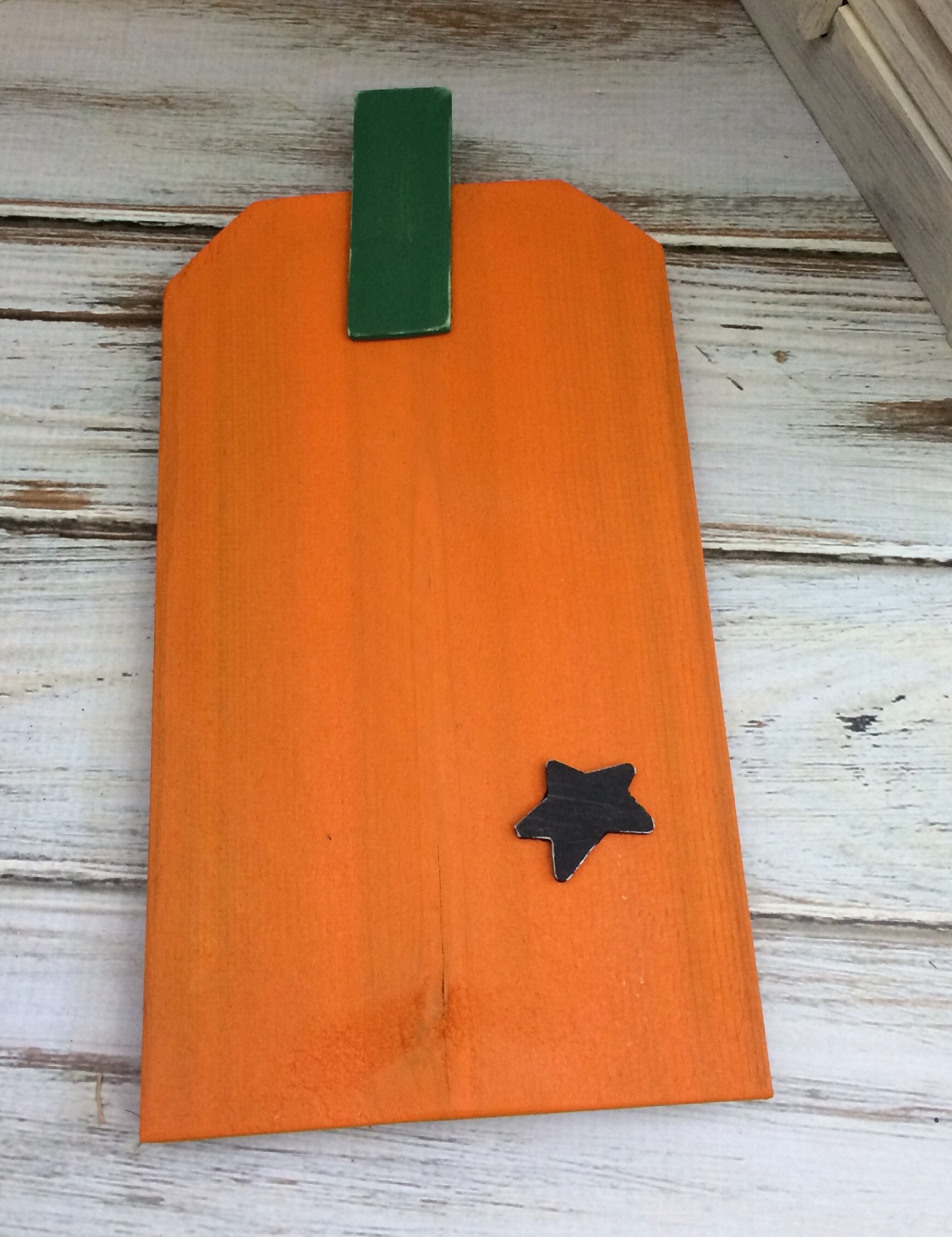 I took a leftover piece of a cedar picket approximately 7″ in length, gave it a quick sanding then gave it a coat of orange acrylic paint.