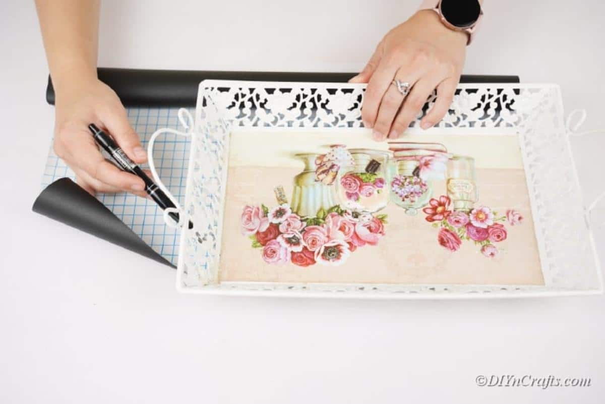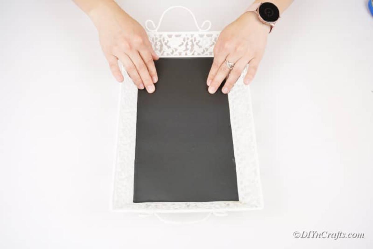 After you've cut and measured your piece of chalkboard paper, apply it to the flat center of the tray. If using spray paint, spray the area not covered by painter's tape before proceeding. Be sure to give it ample time to dry.