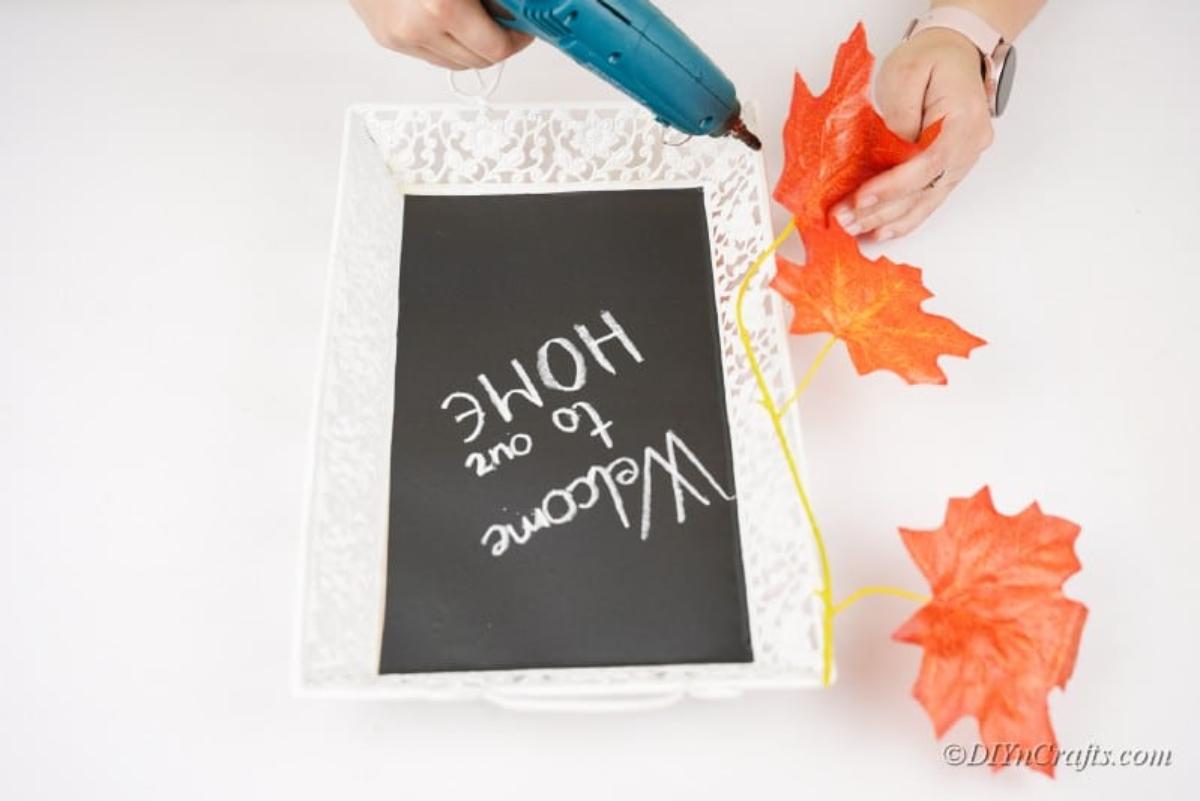 Once the chalkboard paper is securely in place, you can add whatever type of phrase, quote, or fall-themed saying you'd like! At this point, you can use a hot glue gun or traditional glue to secure fall-themed motifs like leaves, pinecones, or even Halloween characters.