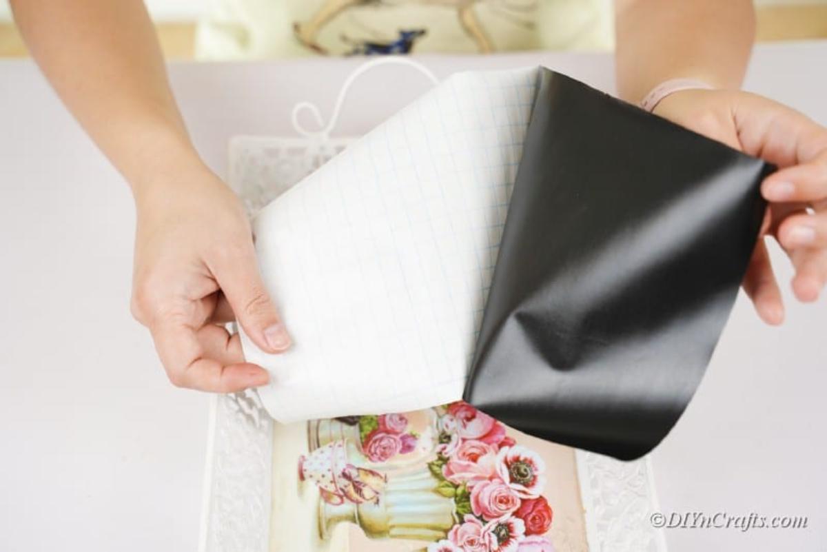 After removing the backing from the chalkboard paper, be sure that it's perfectly aligned in the center of the tray before pressing down. If you're using spray paint, ensure every piece of the tray you don't want painted is covered with plastic or tape.