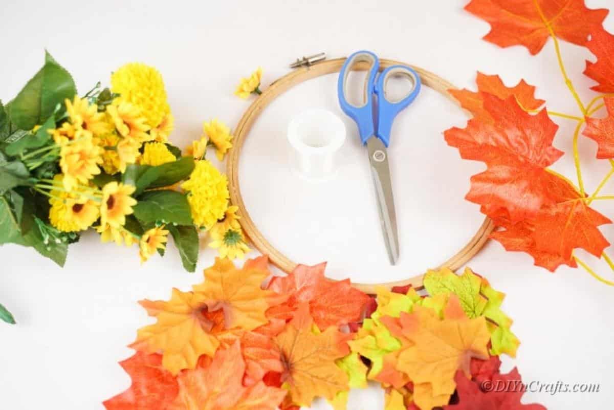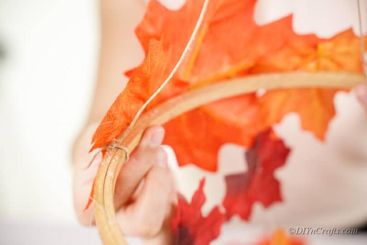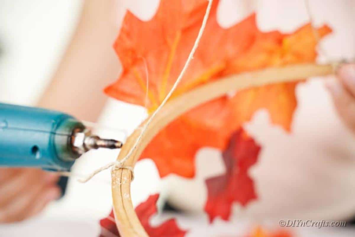 Tie one of the upper strings to your craft hoop. Then, use the hot glue gun to make a few stripes of glue where you'll add loose leaves to the outside edge of the hoop.