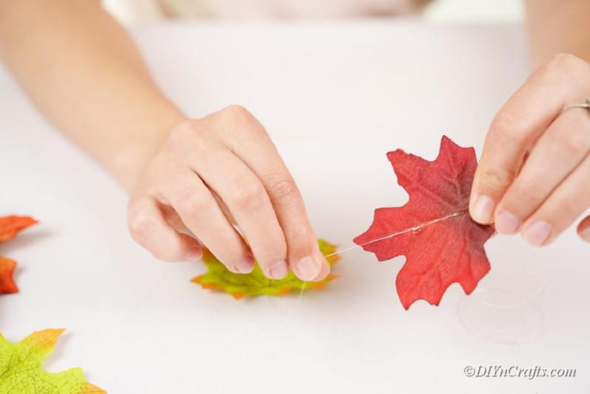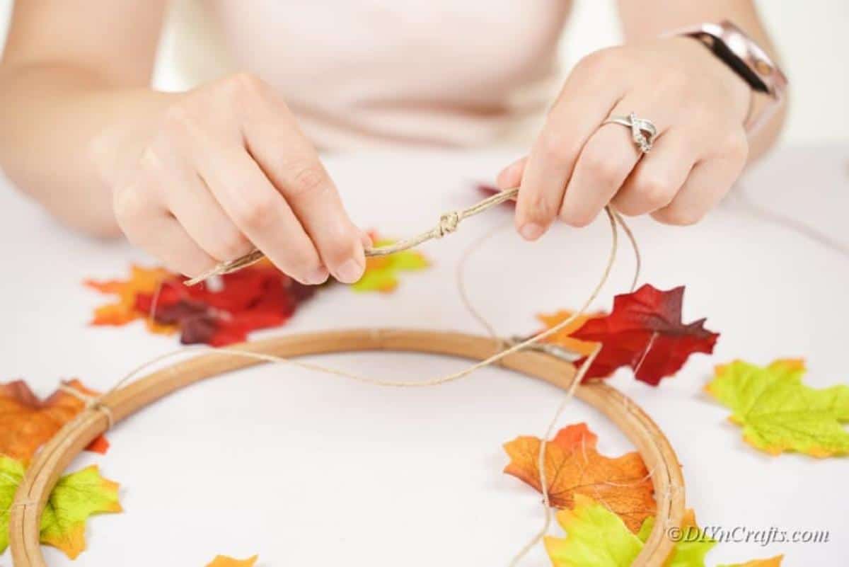 At this point, you can string your strands of leaves onto the wooden hoop! The best way to do this is, of course, to tie them straight onto the hoop.