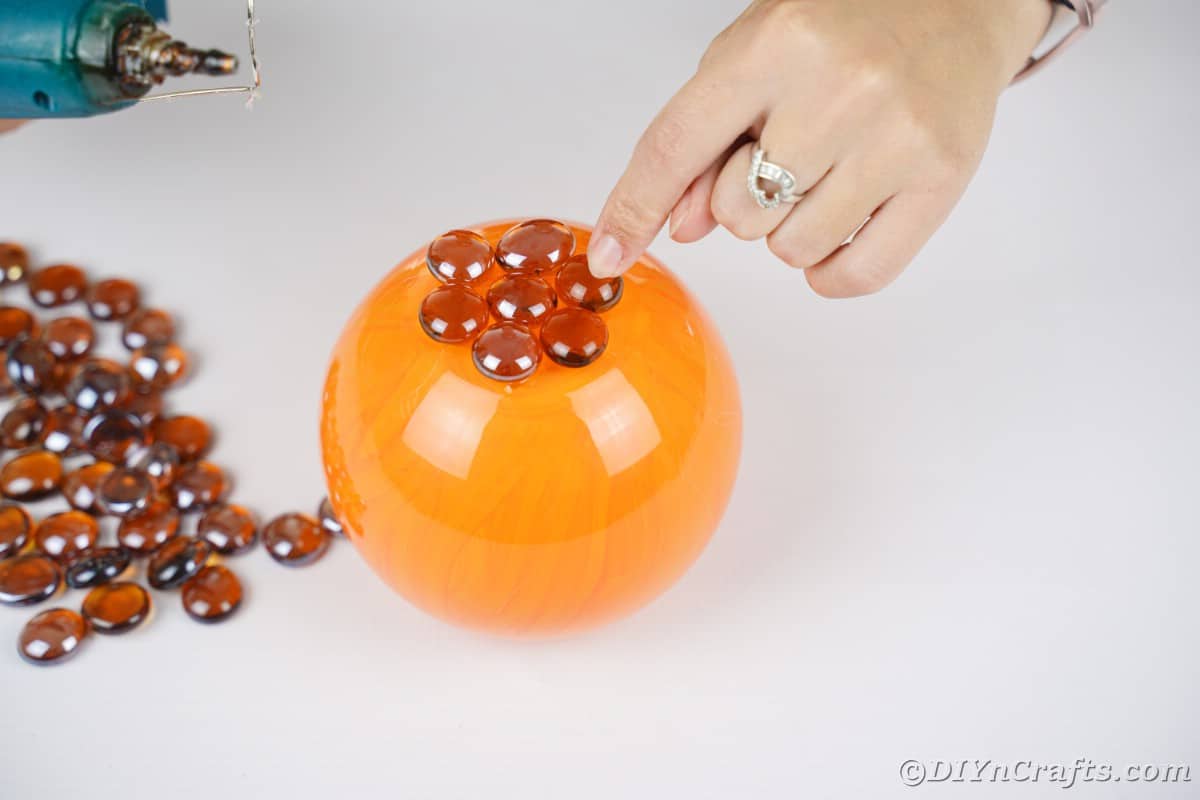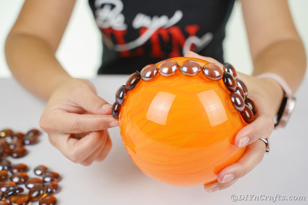 When the top is covered, begin gluing the rocks down the side of the pumpkin. A single line of rocks to create a "line".
