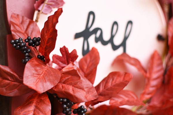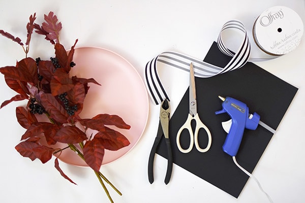 To make a fall wreath using a plastic plate for it’s base, begin by gathering all your faux greenery. I used all red leaves with a few dark purple berries for mine. You may need to use wire cutters and remove some of them from their main stem.
