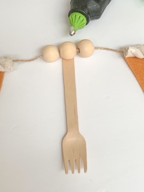 Next string 3 wooden beads on the twine, alternating gluing the pie slices and stringing the beads. Finally glue the bamboo fork on the back of middle bead in each section.