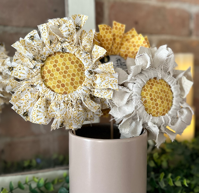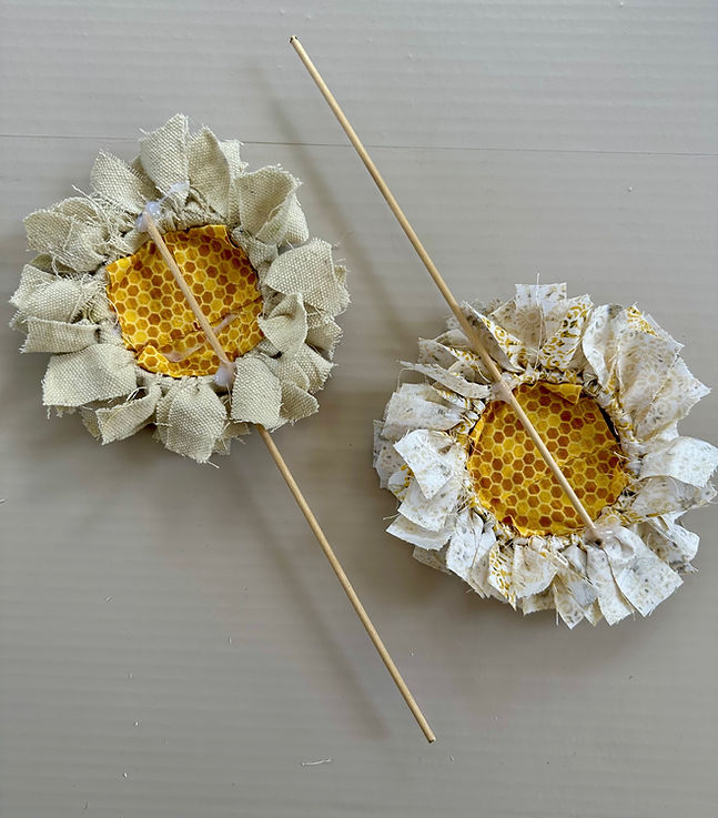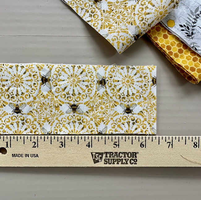Fabric scraps 6 1/2 inches in length and about an inch wide. The fabric strips do not need to be perfectly cut, the cuts don't have to be straight and the widths don't have to be exact. Raw edges and size variations are what give the sunflower character.
