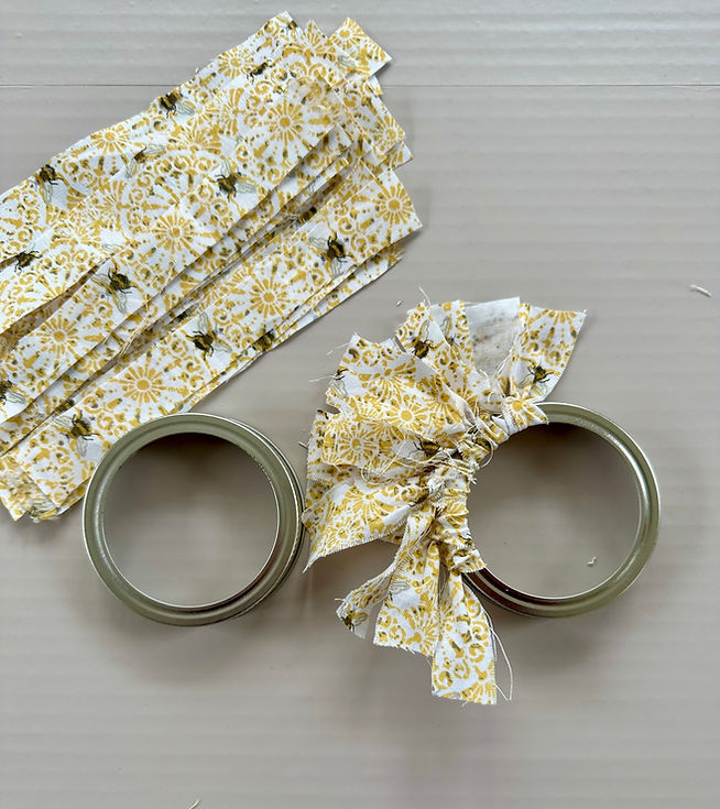 To create the farmhouse sunflower tie the strips of fabric to the mason jar ring. There is no need to double not the fabric. Tie the fabric strips tightly and work your way around the ring. Slide the fabric knots close together this step will ensure a full sunflower.