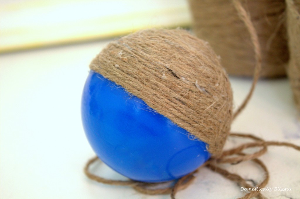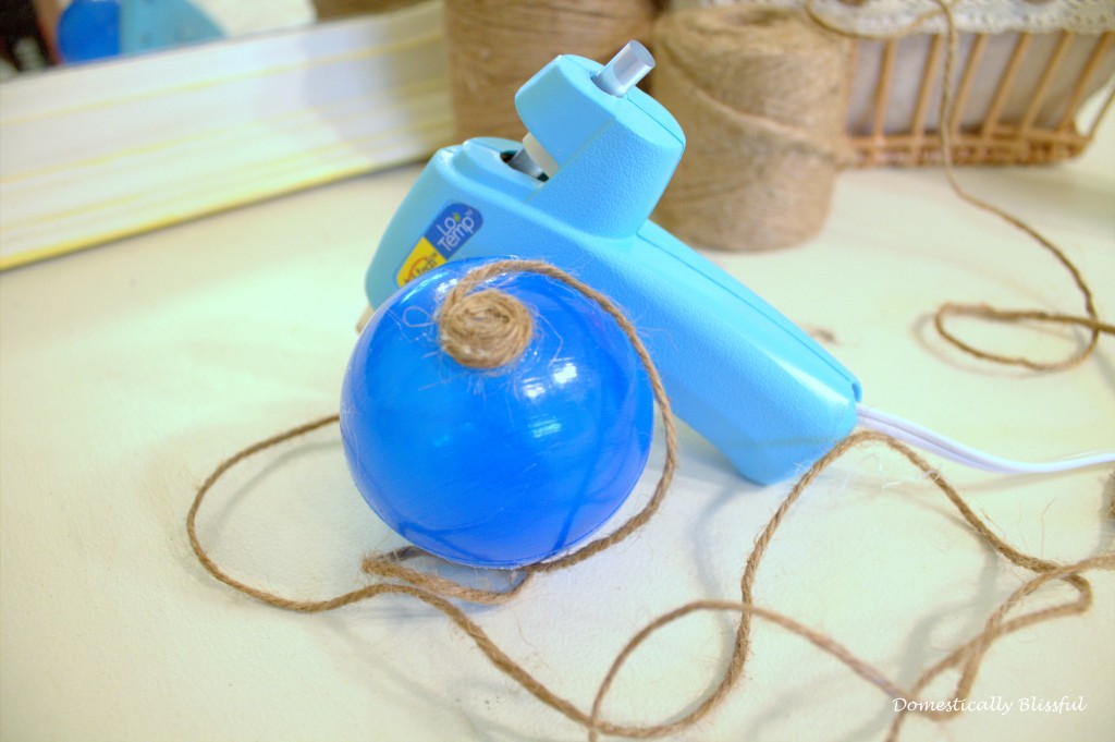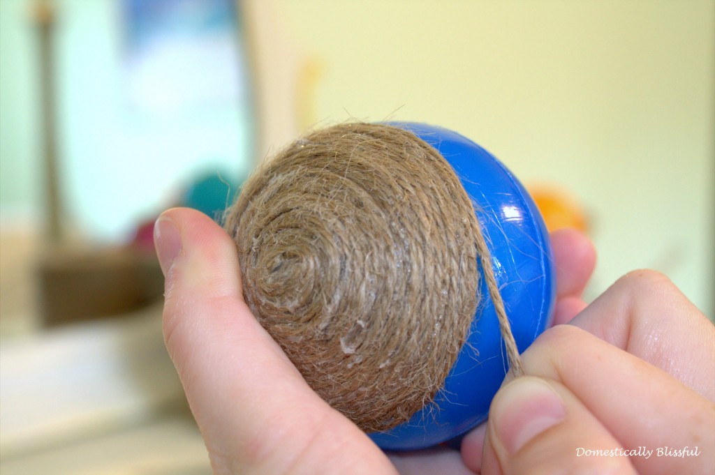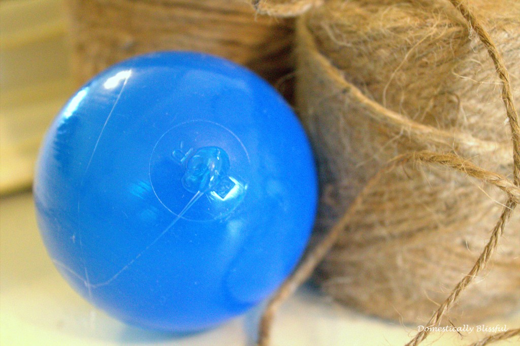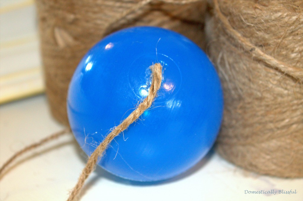 (If you are worried about the bright pink, green, or blue showing through, you can always spray paint the plastic balls the same color as your twine before you begin this project.)