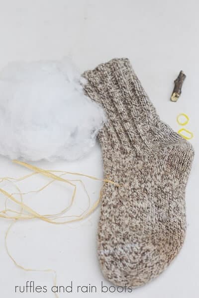 Gather the opening at the top of the sock and insert the stick. Close the opening with a small rubber band.