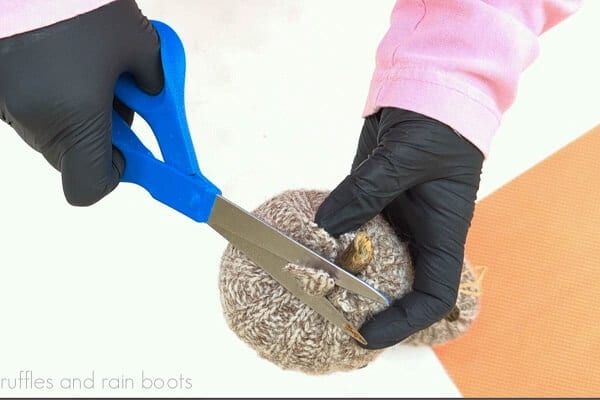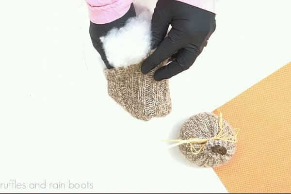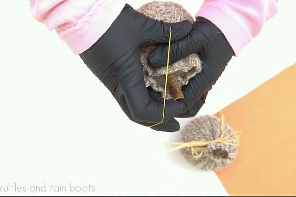 To make a pumpkin with a sock, gather the sock at one end and using a rubber band, close it off. Turn the piece inside out.