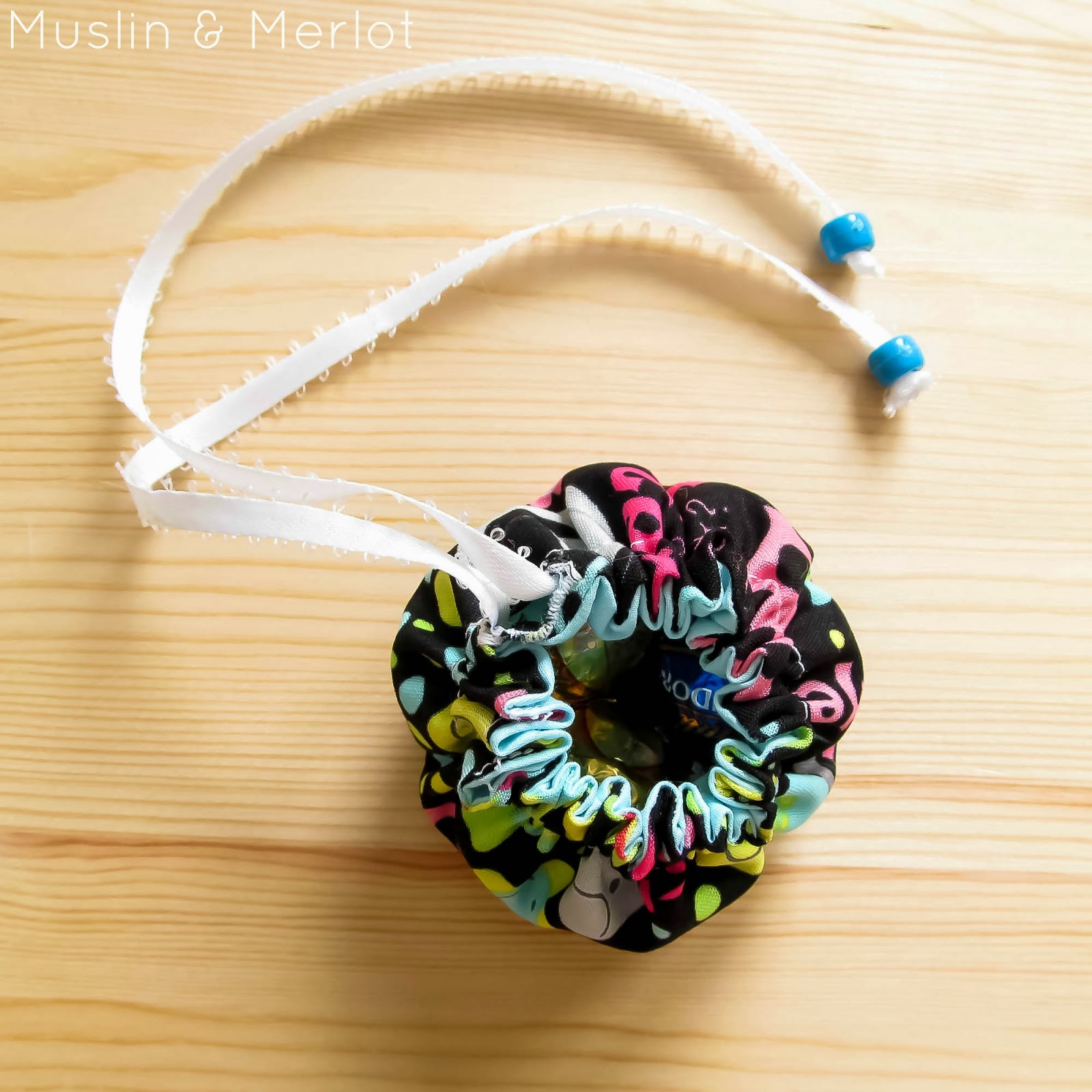Attach a safety pin to the end of the ribbon. Push the safety pin through the buttonhole and around the circle. Push out through the buttonhole. Pull on the ribbon ends to scrunch up the opening.