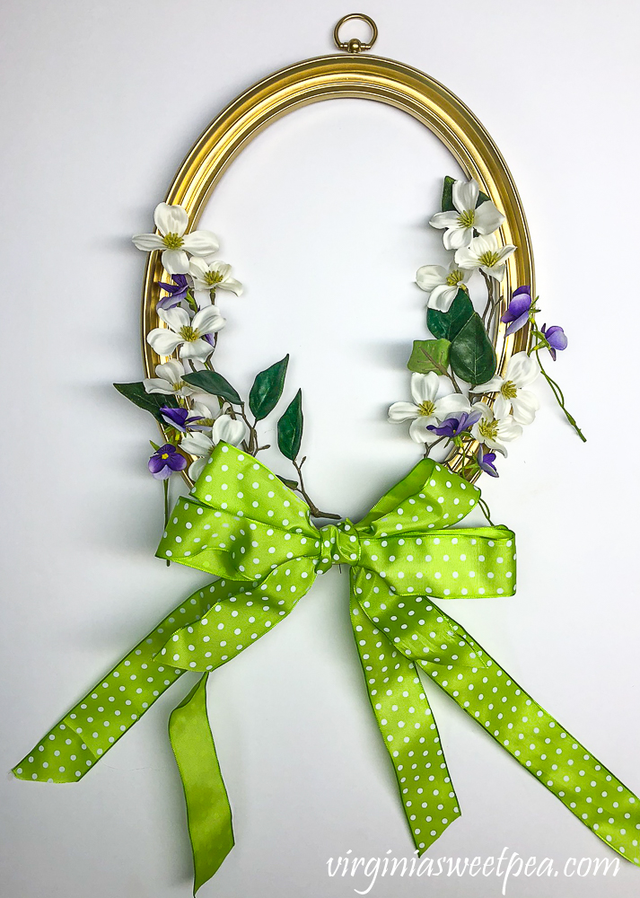 Make a bow using ribbon and floral wire. Glue to the frame. (I originally used a green bow and then changed my mind and switched it to a lace-trimmed burlap one.
