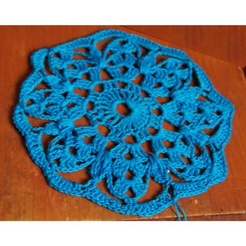 6.*sc in next trsh sp, 5 ch, trc in the corresponding 1-ch sp on 3rd Row, taking in the stitc also the 8-ch sp in 5th Row and the 5-ch sp in 4th Row, 5 ch* ; Repeat * to * 8 times; join with sl st to first st.