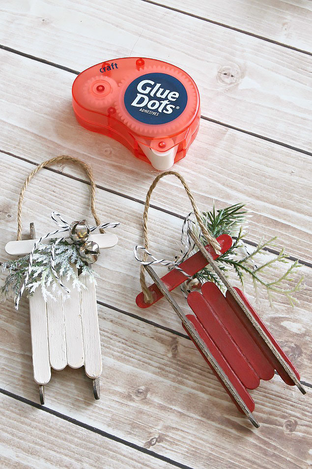 • Add whatever embellishments you would like. I took a few little sprigs of faux greenery, wrapped them in baker’s twine, and then threaded on a couple of small jingle bells. I then just tied the baker’s twine around the cross bar. If you’re doing this project with kids, they could decorate the sled or write their name and year on it. I’ve even seen some that add a photo to the sled.