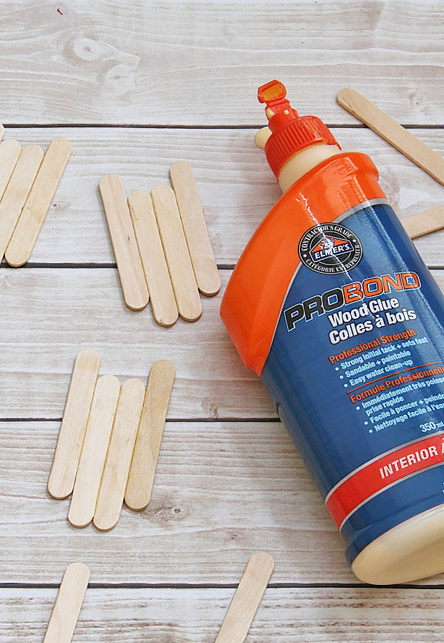 • Glue 4 of the small craft sticks together staggering the end stick on each side slightly lower. I found the easiest way to apply the glue for this project was to squirt some glue out onto a paper plate and then use a large toothpick or skewer to apply the glue along the edges. Allow to dry.