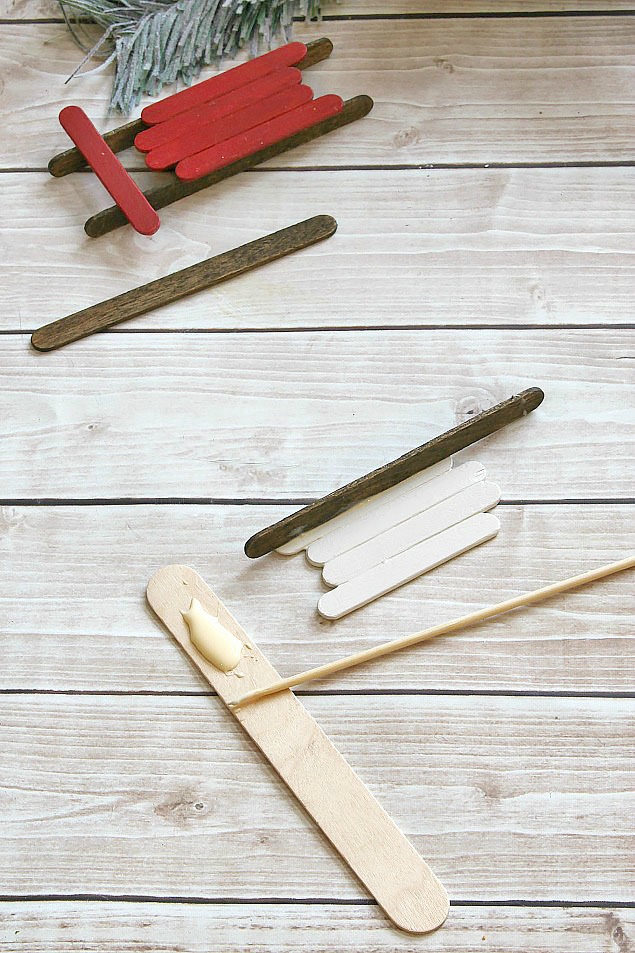 • Glue on the stained sled runners to the smaller popsicle sticks. Again this is much easier to do if you use a skewer or large toothpick to apply the glue.