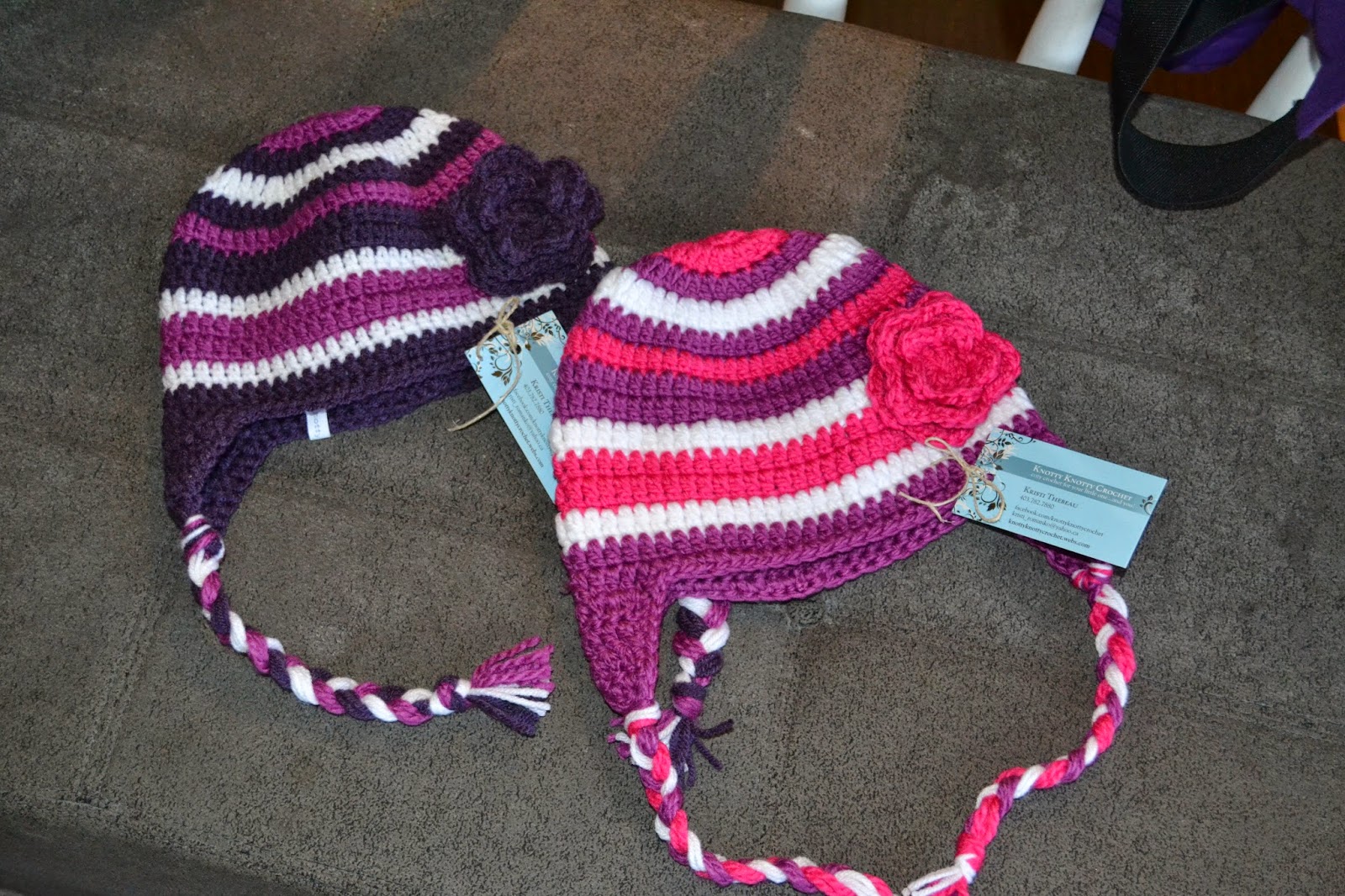 ADDING EARFLAPS1) Fold hat flat with the joining seam in the middle of the back. Be sure the front of the hat is facing you. Count in four stitches from each side and place a marker at both spots. count back 10 sts, including the st the marker is in and place another marker at each spot. This is where the earflaps should be. Join yarn (I join the left earflap from the front of the hat and the right one from the back so my flaps both look the same.) ch 2, dc in same st as ch 2. dc over next 9 st. (10 dc, as ch 2 does not count as dc) ch2 turn2)dc2tog dc till 2 sts remain. dc2tog. ch 2. trun.3) dc2tog over next 2 sts. dc until 2 sts remain. dc2tog. ch 2. turn.4) Dc2tog over next 2 sts. dc until 2 sts remain. dc2tog. ch 2. turn.5) dc2tog over next 2 st. dc. dc2 tog over next 2 st. do not fasten off. turn work so that right side is facing you. sc evenly down side of earflap, sc in each st around. fasten off with invisible knot.