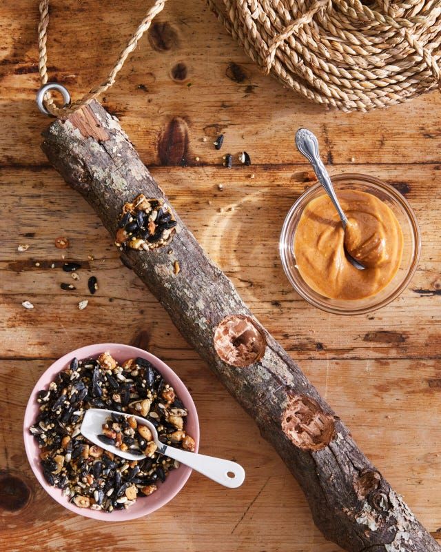 To make: Screw a screw eye bolt into the top of the branch for hanging. Drill holes in a branch using a spade bit. Fill holes with peanut butter then bird seed. Thread a length of rope through the bolt and hang. Refill as needed.