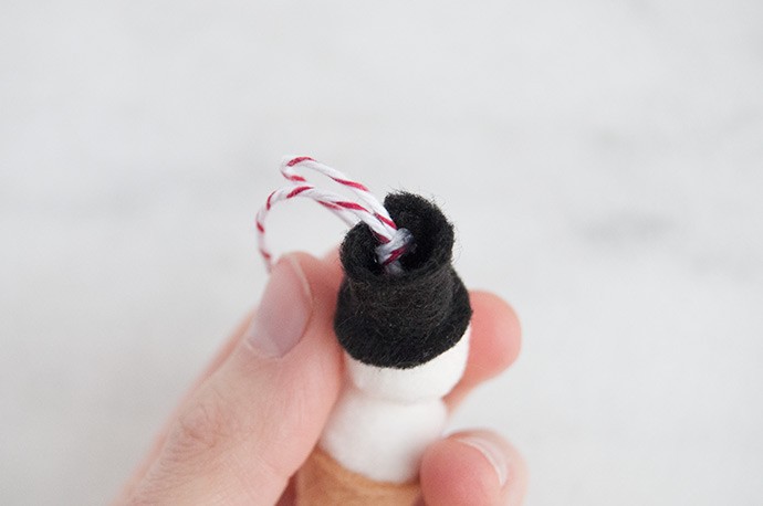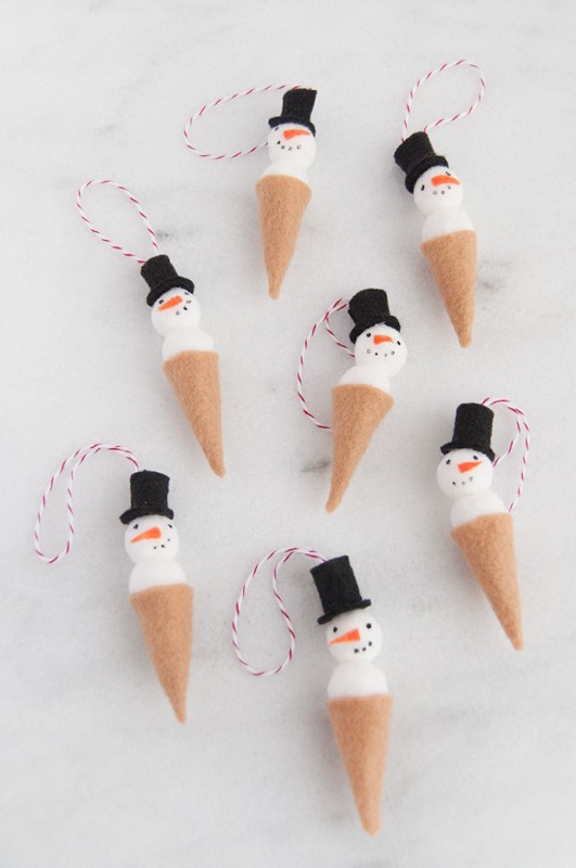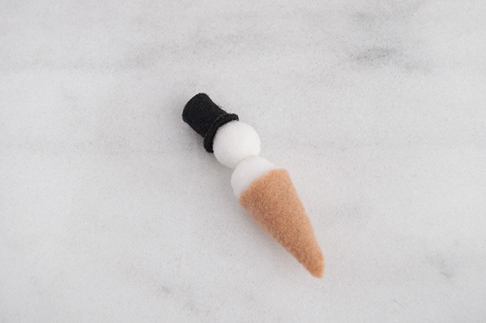 Prepare your pieces – the image above shows what you’ll need for one snowman ornament. Cut the tan felt into a 90-degree wedge with a curved edge, testing it by rolling it into a cone shape. Cut a tiny triangle from orange felt to be the carrot nose. For the top hat, cut a black felt circle about the size of a penny for the brim and for the top hot glue a black felt rectangle into a tube. Gather two white pom poms and tie a piece of string into a loop.
