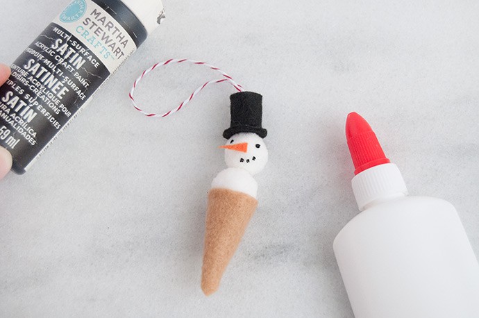 Use white glue to attach the carrot nose to the snowman’s face – hot glue is tricky here as you just need the tiniest dab and you might have it dry before you can attach it to the pom pom. Use a toothpick and black paint to add the snowman’s coal eyes and mouth. Let dry.
