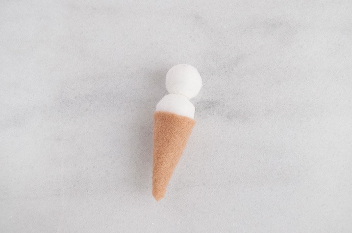 Use hot glue to assemble the felt cone, and attach the two white pom poms inside.