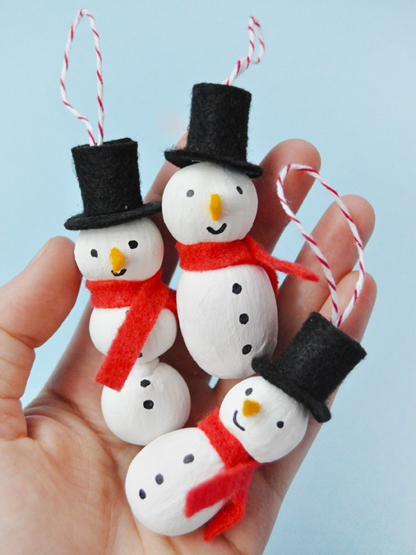 For the snowman, we used both hazelnuts and pecans – you can either glue three hazelnuts together and one hazelnut on top of a pecan. Paint the whole thing white and let dry. Use a black marker to draw on the buttons onto the body. Cut a red scarf out of felt and glue around the snowman’s neck. Draw the face on and cut a tiny triangle carrot nose out of orange felt, gluing that on to. For that hat, roll a black felt rectangle into a tube and glue on top of a black felt circle. Glue the whole thing onto the snowman’s head and then glue a loop of string into the hat for hanging on the tree.